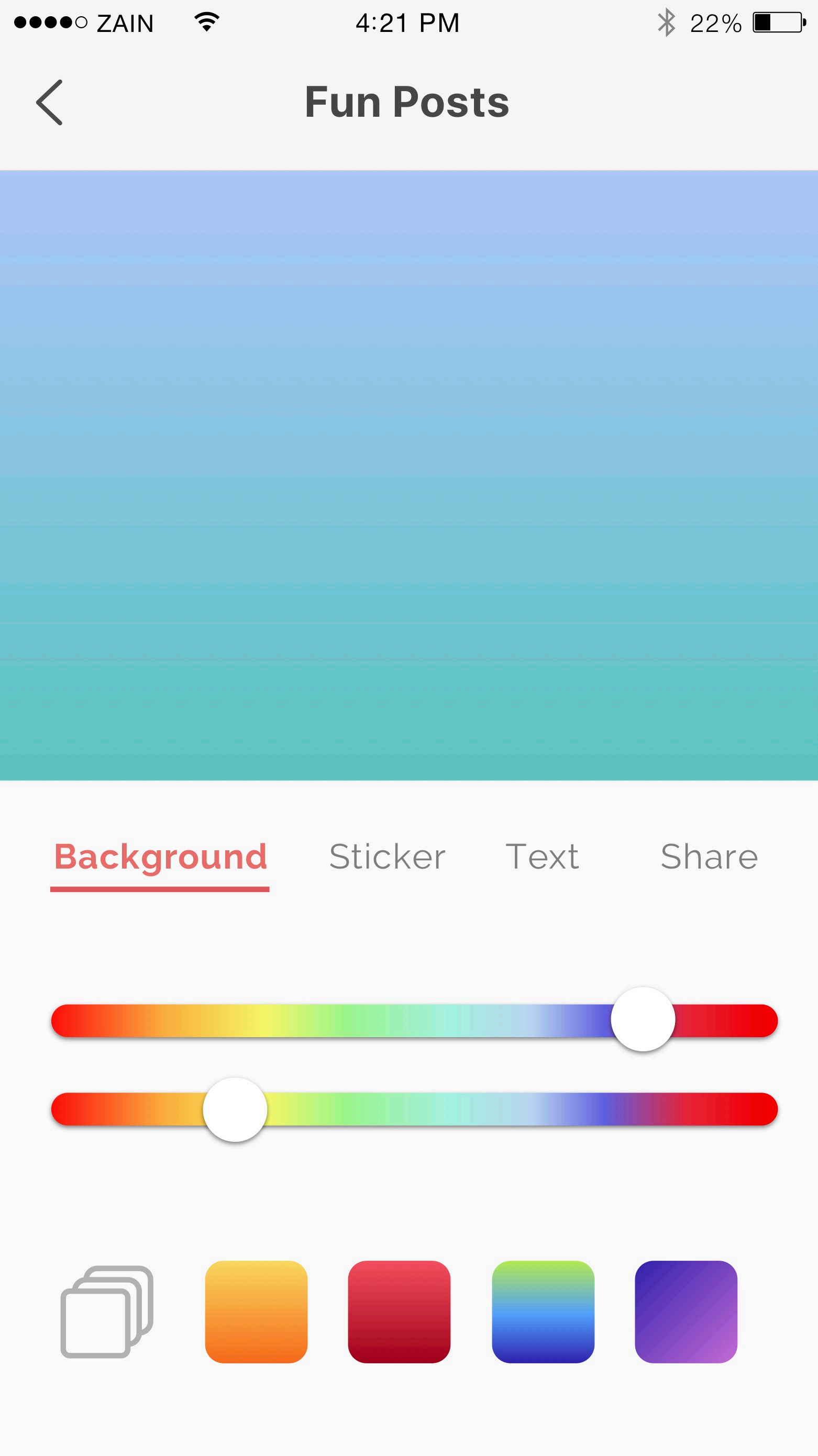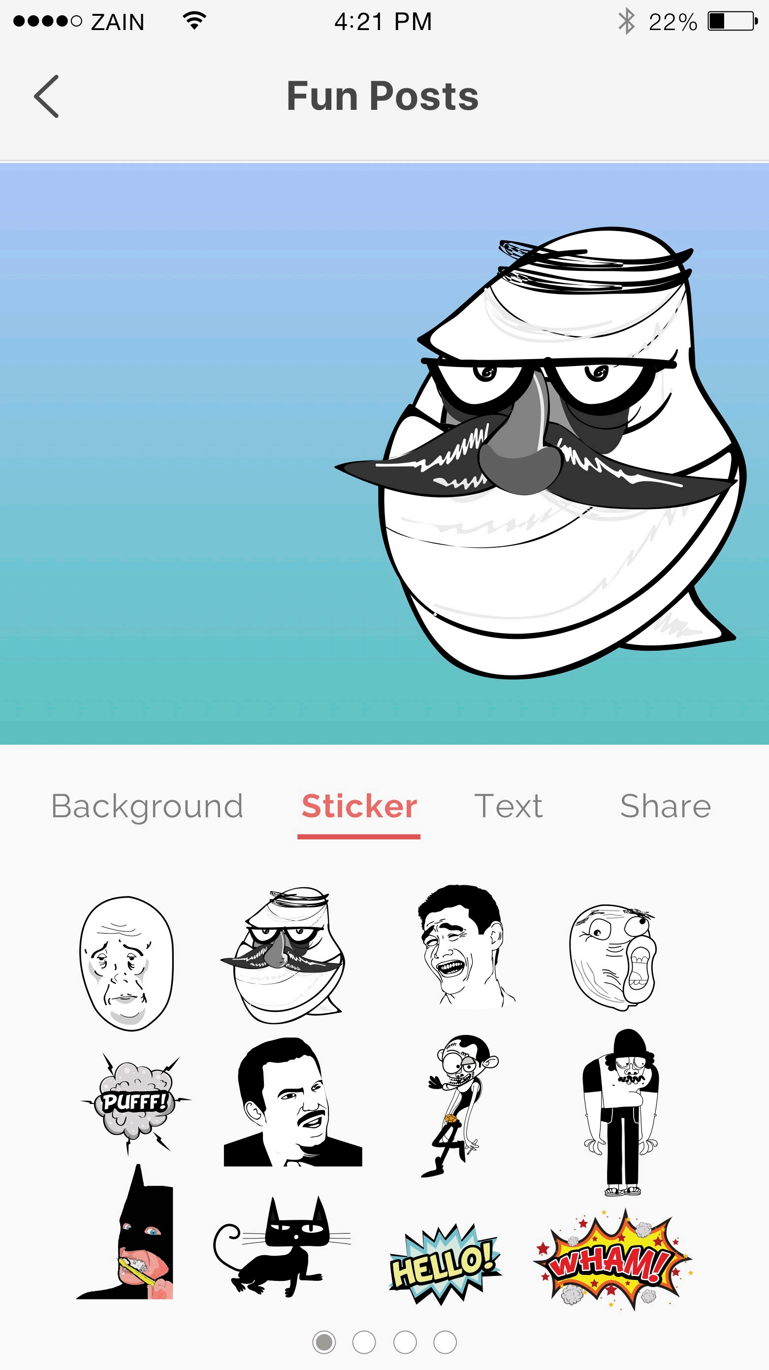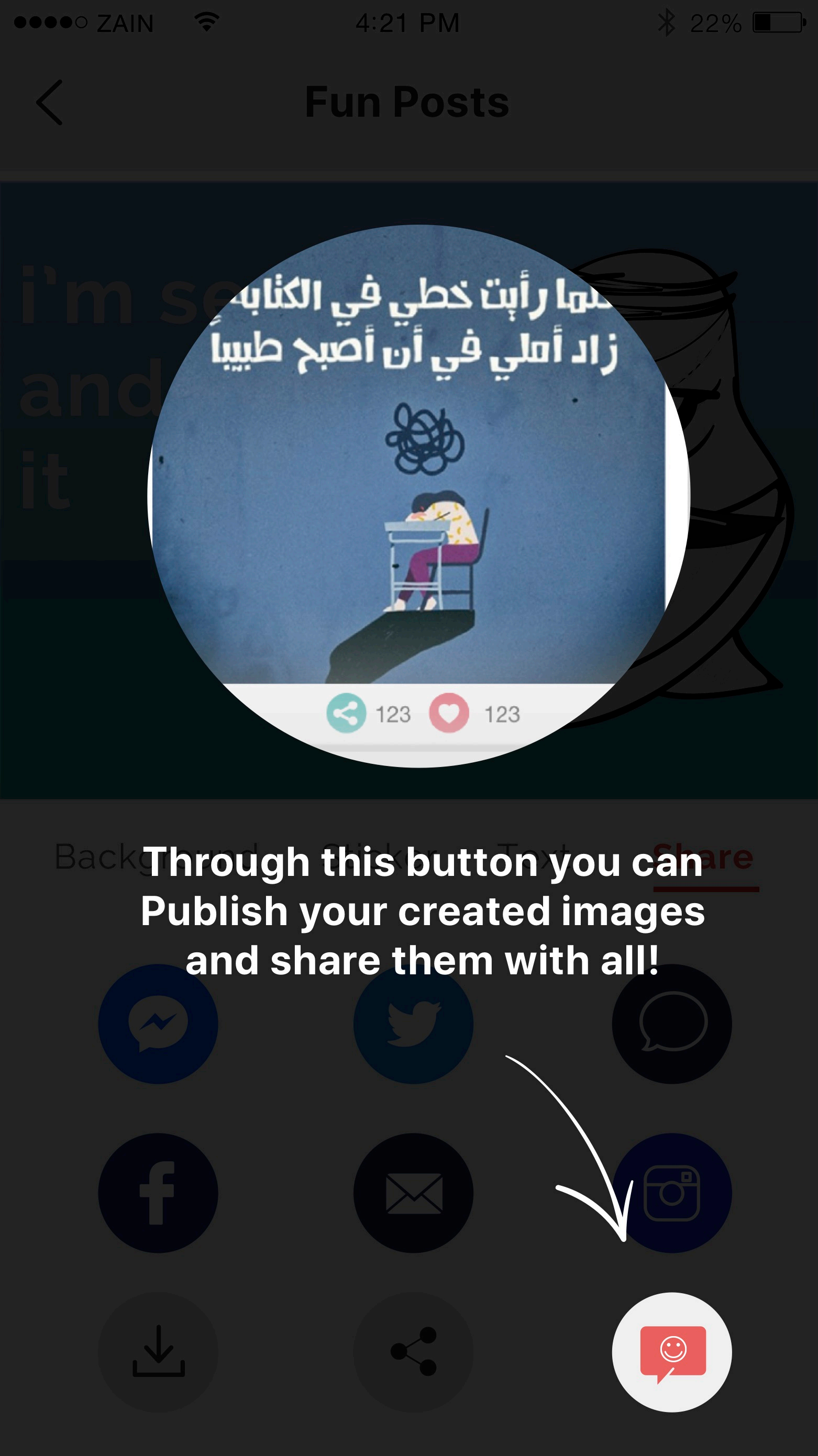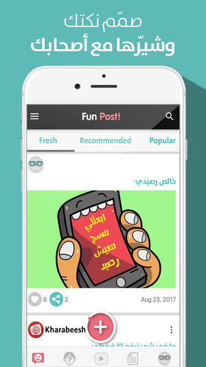 Using Kharabeesh App Fun tab users can create and share their own content of jokes, memes and comics – the user can add photo, change background color, edit photo, add s5ckers and text to the photo in order to create a new content and share it to Kharabeesh community and social media, Also the user can upload and watch videos aker approval from Admin side.
