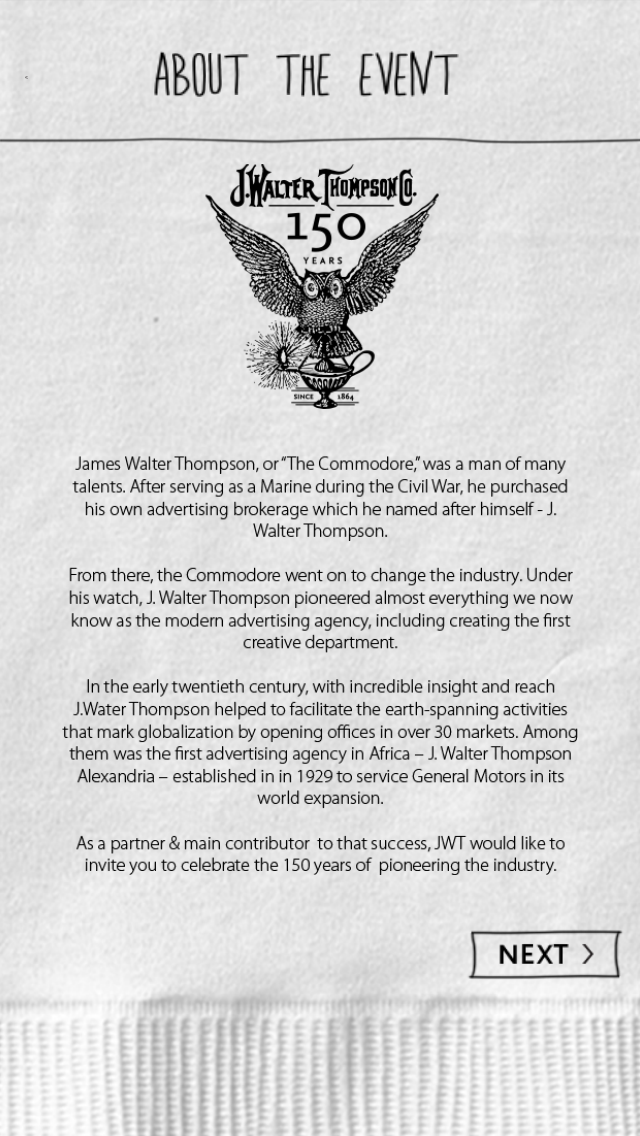 Users were able to scan logos of all customers that worked with JWT and through the app they were able to view the oldest ad that was made for their brand. They were also able to take pictures from the app and share them on the screens and projectors at the event to be viewed by all aSendees as well as a nice memory note to be seen by everyone. The App included AR (Augmented reality) that was made specially for this purpose with a state-of-the art image processing technology