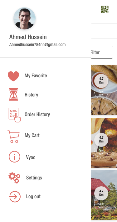A mobile application for a Kuwaiti food services startup that enables its users from scanning through all the food and beverage service providers, check all their menus and see all the related information, order through the app to receive it at home hot and fresh.On Vyoo, users can filter their orders by location or nearest service provider, by category or even by price.