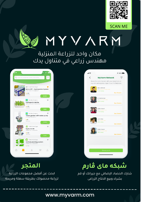 MyVarm Network is where you can start your home farm in easy and simple steps. it’s the place for all Urban farms needs. without any previous knowledge in agriculture you can start and follow our guidance in MyVarm Grower App, MyVarm is an innovative Agritech start-up offering hydroponics micro kits for growing fresh produce. MyVarm app provides technical support, tracks system readings and links users with a supportive community also to sell or exchange their harvest, making it easy to grow your own food and contribute to a more sustainable future.